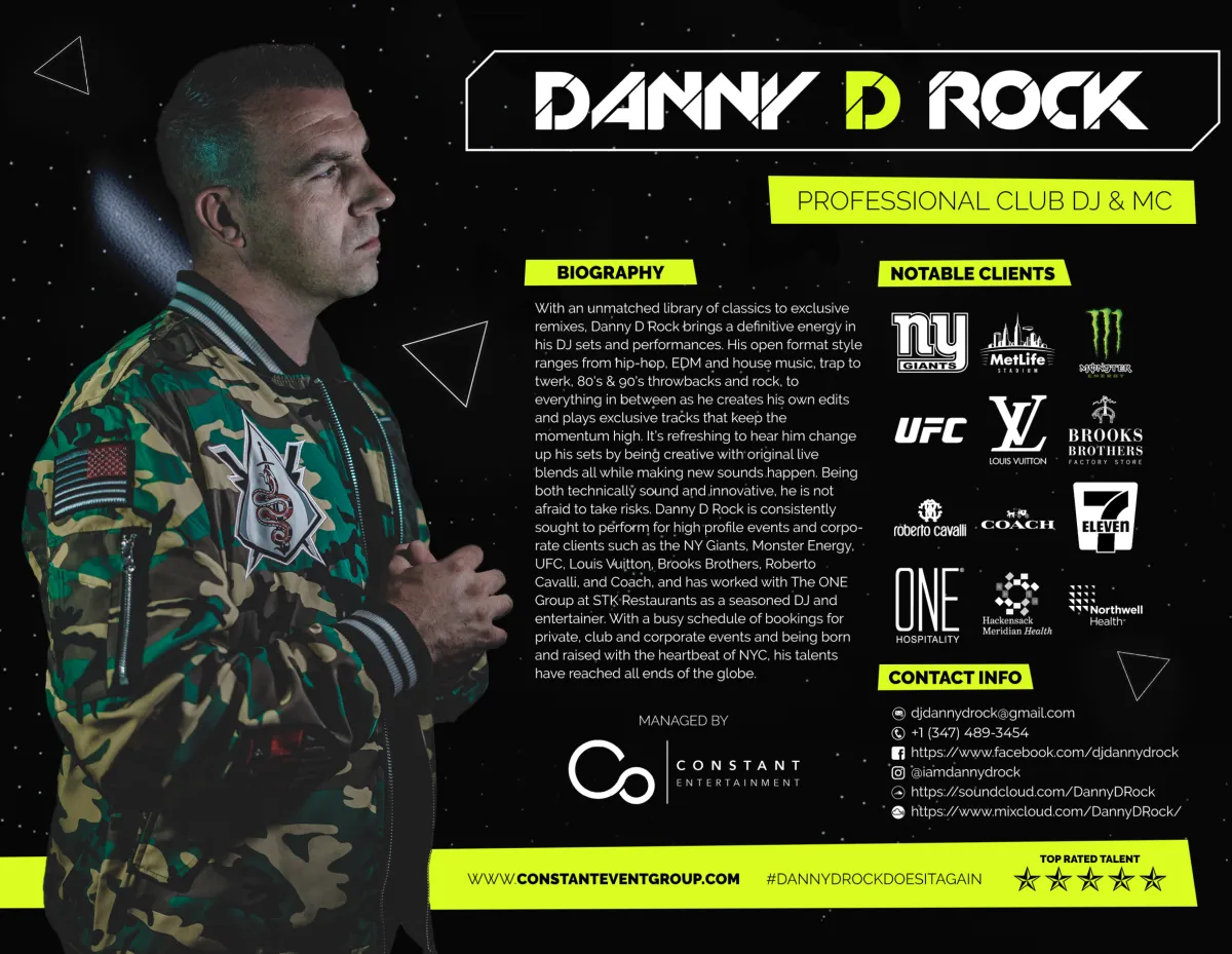 Danny D Rock’s musical career is truly extraordinary with performances alongside global headliners in iconic NYC clubs and beyond. Having shared his music and talents in cities such as Miami, Chicago, Atlanta, Salt Lake City, Burlington, Houston, Austin and the countries of Bahamas, Argentina and Peru, his versatility shines with a dynamic range of musical styles that keeps dance floors buzzing. Danny’s intuitive crowd interaction ensures a seamless event flow, creating unforgettable experiences from private and corporate events to large scale stages.